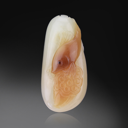 編號:RY32-321 作品構思巧妙,鯉魚躍然而起于荷花之間,喜慶之意呼之欲出。“魚”與“余”諧音,自古是深受人們喜愛的喜慶造型,象征吉慶有余、連年有余。且玉質上佳,工亦良工,遠觀近看寶氣盈盈。盤之玩之,難以釋手。