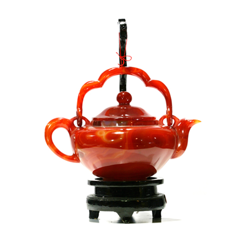 編號:0Q1012-013 此款天然瑪瑙精制茶壺,設(shè)計莊重大氣,拋光均勻,打磨光滑,紅色光亮迷人,優(yōu)雅別致的瑪瑙提梁壺,配上精美的紅木龍頭底座,龍喜水,與茶壺相映成趣,很是完美,既是一款精美的藝術(shù)品,極具欣賞性,又美觀實用。
