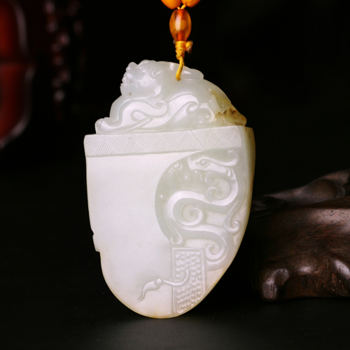 府上興隆題材,亦作“府上有龍”,圖案出自玉雕古圖譜,以古代斧形與斧上盤龍之諧音命名,寓家業興旺。此款玉牌充滿古樸厚重之風:色白皙、質勻潤,上雕龍子貔貅,昂首挺胸,盛氣凌然;下琢斧形,斧面上游龍身形充滿張力,似于云中漫步,靈韻興隆之氣畢現。