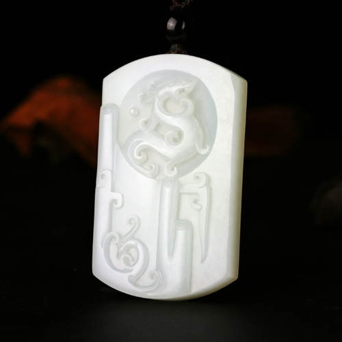此款和田玉龍牌,色潤(rùn)白、質(zhì)細(xì)膩。造器較有特色,上減地浮雕螭龍居于上,昂首挺胸,盛氣凌然。下有造型寫(xiě)意抽象的鳳首回眸,似聞鳳鳴九霄,靈韻之氣畢現(xiàn)。整牌彰顯大器穩(wěn)重,可謂賞之有味。且大小適中,可佩戴,也適于把玩。