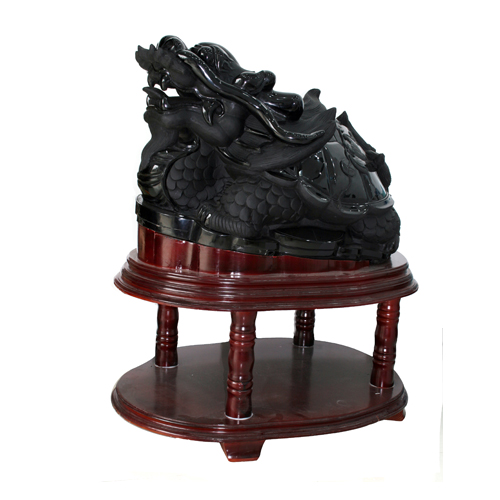 本件作品由整塊天然黑曜石精工雕琢而成,體態完美,威武大氣。以吉祥四靈之一的龍龜為題材,龍龜是瑞獸一種,形態為龍頭、龜背、麒麟尾,主吉祥招財,化三煞。龍龜放在財位可催財,放在三煞位或水氣較重之地最有效,風水學有云:“要快發,斗三煞”。水氣重之風水位主是非口舌,龍龜在位能化口舌兼加強人緣。黑曜石是一種火山熔巖,人們相信黑曜石極度辟邪,能強力化解負能量。中國古代的佛教文物中,就有相當多有關于鎮宅或避邪的黑曜石圣物或佛像。