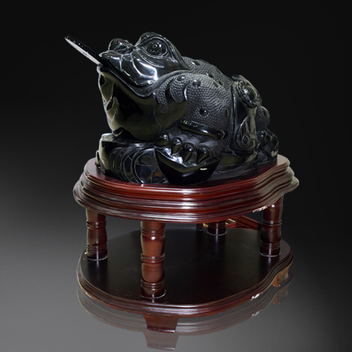 融入圓雕,浮雕手法精心雕琢的瑞獸三足金蟾,工藝細膩,造型豐滿,生動逼真。傳說金蟾為靈物瑞獸,是對主人有利的招財飾物,能催旺財氣。人們相信蟾能辟兇邪,鎮宅,助長壽,是主富貴的首選吉祥之物,故有“得金蟾者必大富大貴”之說。三足金蟾壽命很長,傳說可以活到三千歲,得之者無不大富,金錢纏身。故金蟾代表“祿”。