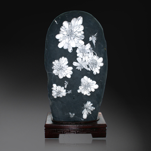 天然菊花石是瀏陽河天青石中含凸鏡狀灰?guī)r,經(jīng)數(shù)億年地質(zhì)變化,演變而成。乳白色天然花形,酷似盛開的朵朵菊花,紋理清晰,界線分明,質(zhì)地堅(jiān)實(shí),花形千姿百態(tài),蔚為奇觀,潔白美麗的花瓣是由天然的天青石和方解石組成。中華人民共和國地質(zhì)礦產(chǎn)部將其列入寶石類,并命名“玉疊妃”。因其蘊(yùn)量稀少,比珠玉寶石類更珍貴。故又被稱為“全球第一”。 菊花石的發(fā)掘,雕刻成工藝品,則始于清乾隆年間,當(dāng)時(shí)只作宮庭貢品,后才在民間流傳。一九一五年巴拿馬萬國博覽會(huì)上,菊花石雕“梅、蘭、竹、菊”橫屏參展,榮獲金獎(jiǎng),震驚世界,驚嘆“石頭能開花”,從此享譽(yù)全球。
